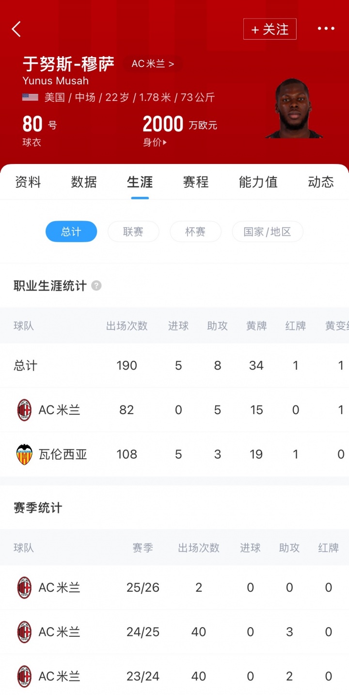 穆萨现年22岁,司职中场,加盟米兰后球员总计出场82次,贡献5助。目前穆萨德转身价为2000万欧元。